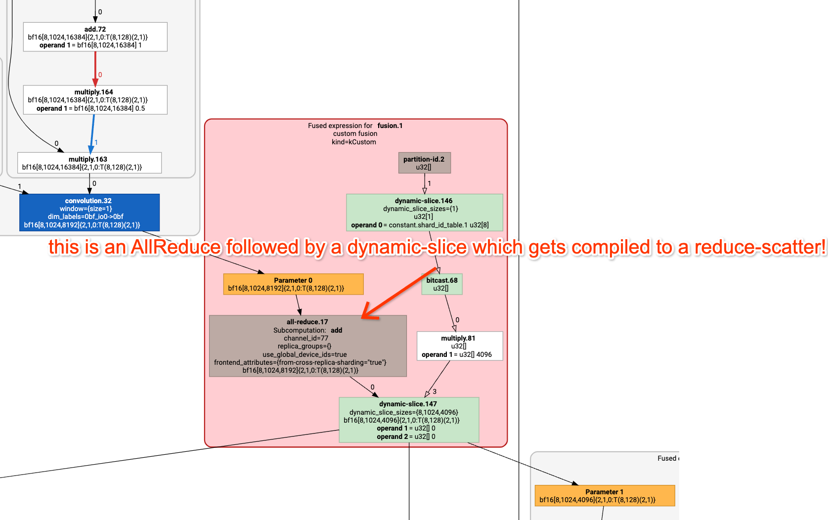 %fusion.1 = bf16[8,1024,4096]{...} fusion(...), kind=kCustom, calls=%all-reduce-scatter.1
