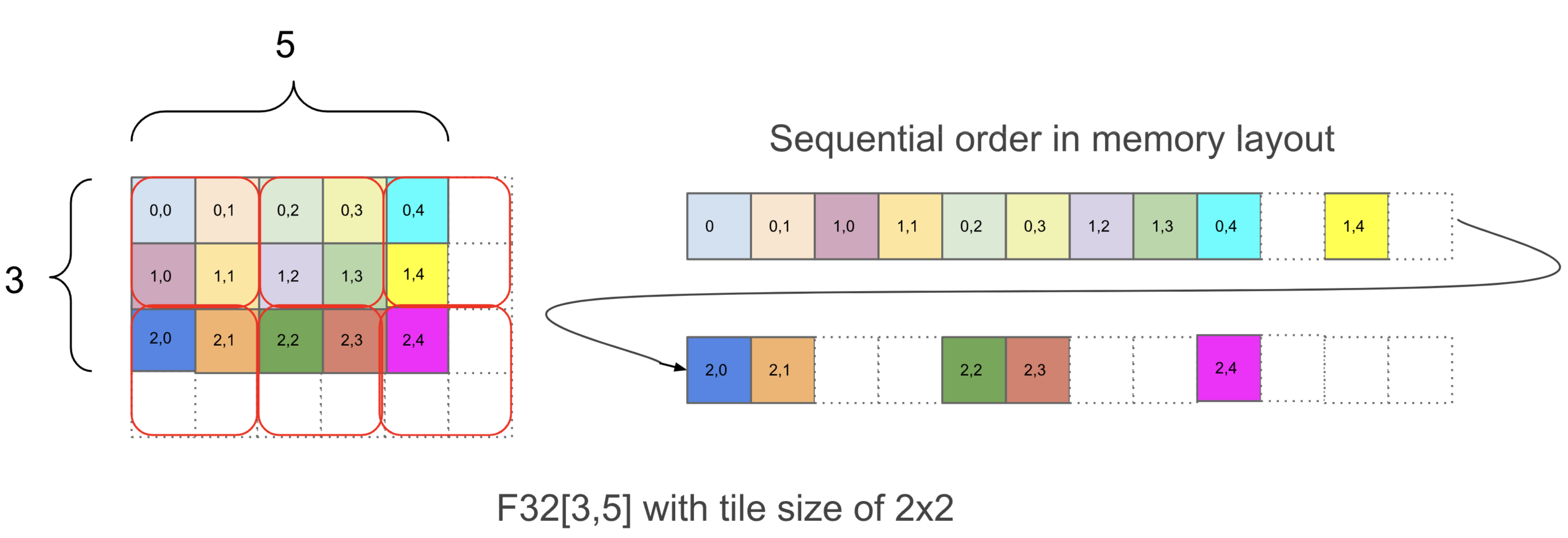 1,0:维度在内存中的顺序(从右往左读)T(2,2):以 2×2 块 tiling更复杂的例子:bf16[4,8]{1,0,T(2,4)(2,1)}