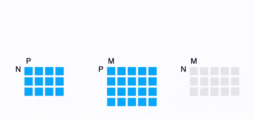 \[\begin{array}{cc} \textrm{数组} & \textrm{形状} \\ \hline x & \textrm{[P]} \\ y & \textrm{[P]} \\ A & \textrm{[N, P]} \\ B & \textrm{[P, M]} \\ \end{array}\]一般规则:两个张量相乘时,收缩维度和批次维度只算一次,其他维度全乘起来,最后乘 2。